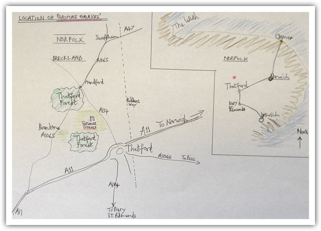 On my visit to Grimes Graves, – a pockmarked landscape of 91 acres with over 400 filled-in mine shafts – my imagination was challengedto visualise the site as one of the busiest locations for prehistoric flint production in the world. Perhaps a scratch of the surface could have turned up a worked flint and I would have been so delighted to think of the purposeful hands so long ago that made a piece of stone into something so useful.